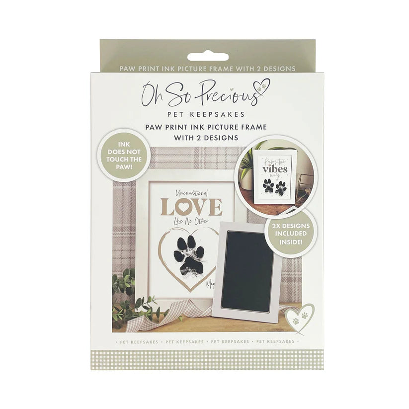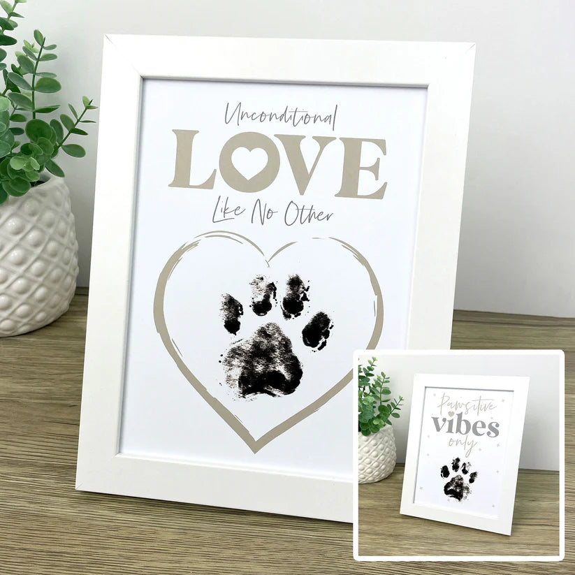 Use our safe, pet-friendly ink pad to capture your furry friend's paw print (no ink will touch your pets paw!), once dried you can then frame it in the white frame which is included.