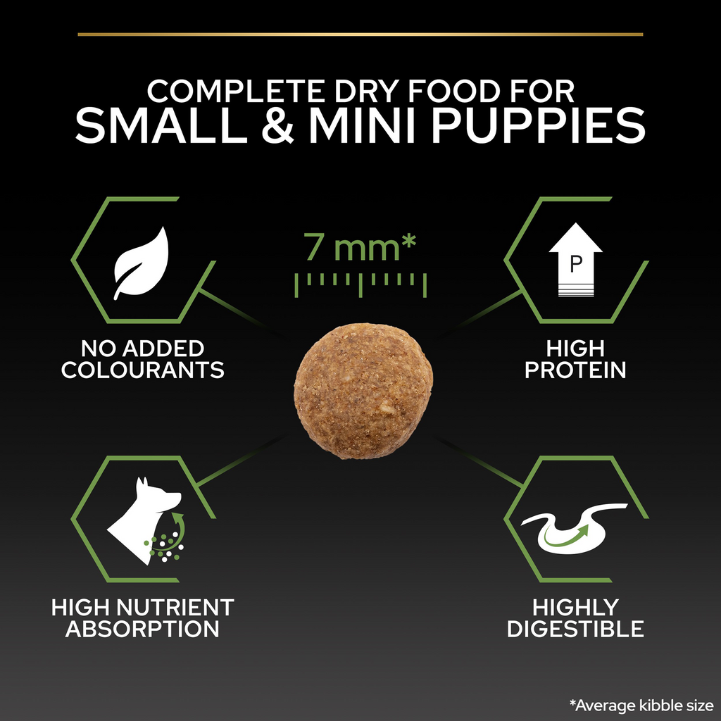 Purina PRO PLAN Healthy Start SMALL&MINI PUPPY is suitable for small & mini breed puppies (less than 10 kg adult weight). This dry puppy food contains vitamin D, minerals and specific levels of omega-3 fatty acids (0.4%) to help support healthy teeth and gums. It is rich in high quality chicken and provides optimal nutrition for your small & mini-sized puppy's growth up to 12 months of age, when they become fully grown.